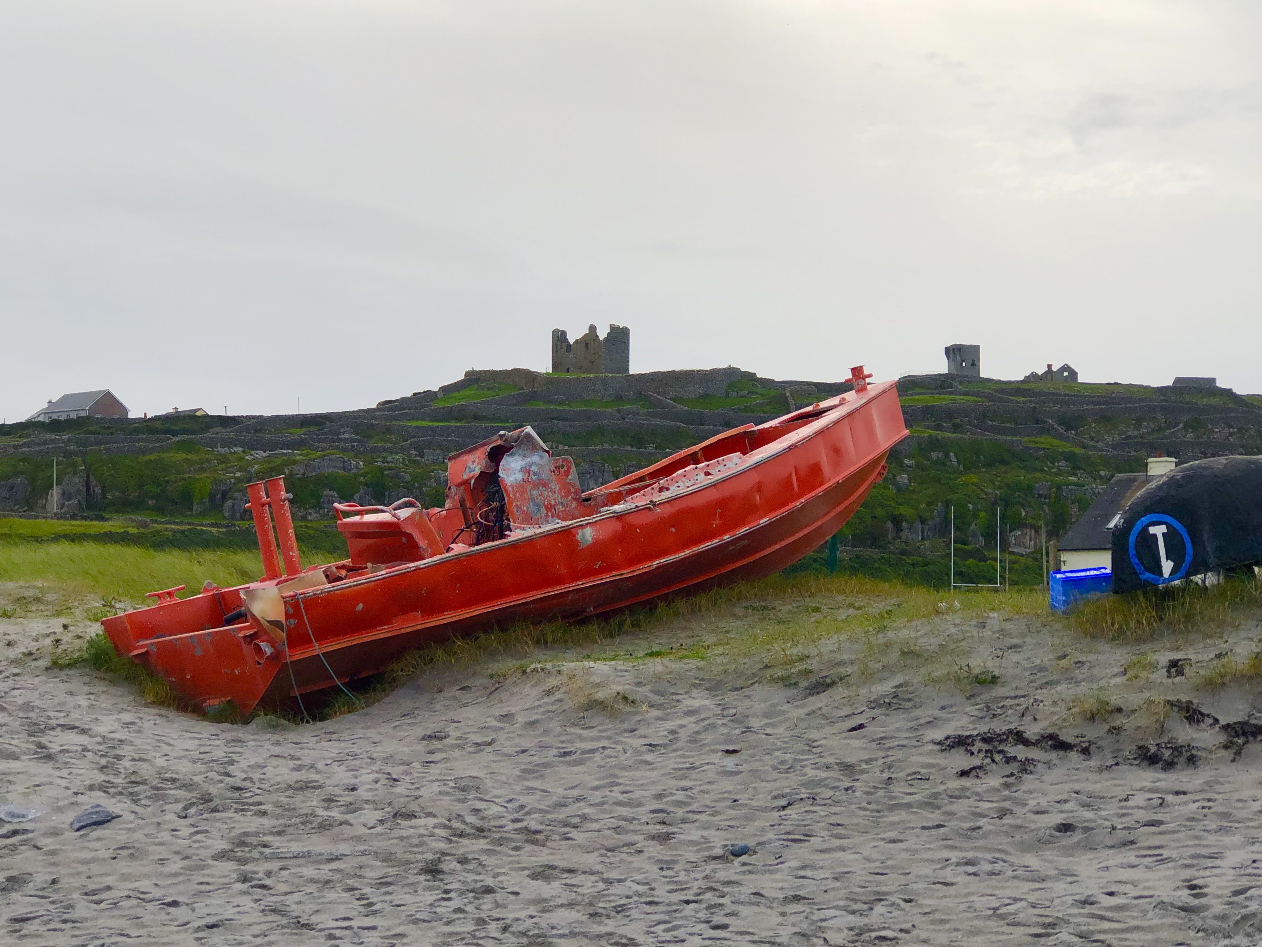 After lunch, we hired a horse and buggy driver to take us around the island. The buggy was much more roomy than the Gap of Dunloe rig. The roads here are narrow and twisty, and are lined with stacked rock walls. It gives you the impression of riding through a series of chutes. On the windward side, we saw the remains of a shipwrecked cargo vessel dating from the 1960’s. Its cargo of lumber was lost in the wreck, but all 11 crewmen were saved.